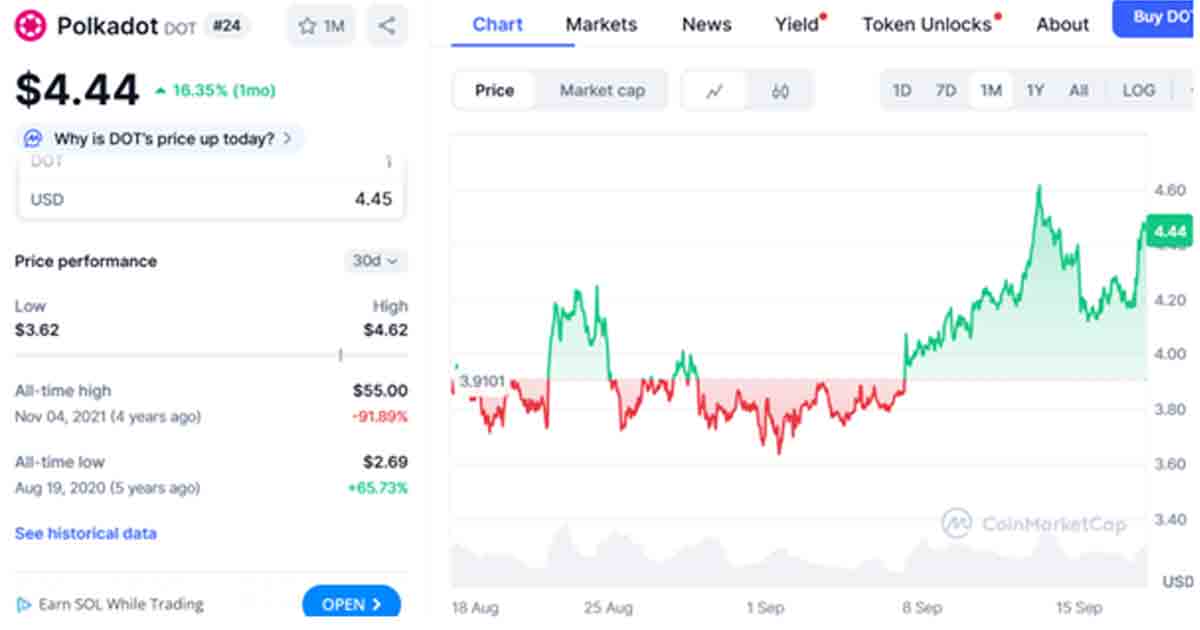 Polkadot is trading at $4.44, a 16.35% rise in the past month. It is the 24th largest token by market cap. The token has recently recovered to the level of $4, indicating a resurgence of buyer activity.