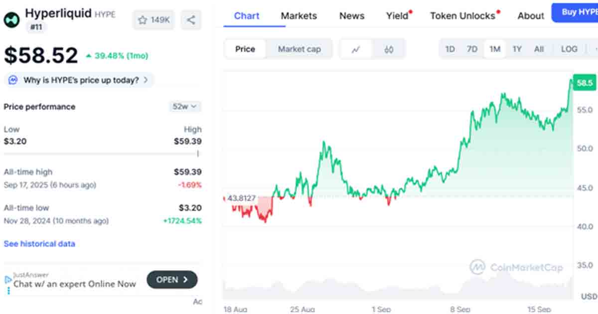 Hyperliquid is priced at $58.52 with a monthly gain of 39.48%. The token ranks #11 and recently set a new all-time high of $59.39 on September 17, 2025, only 1.69% above its current level.