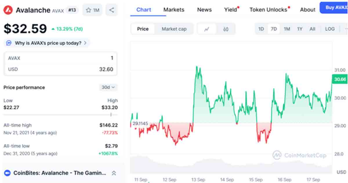 Avalanche trades at $32.59, indicating a 13.29% rise over the past week. Ranked #13, the token has rebounded strongly from lows earlier this month.