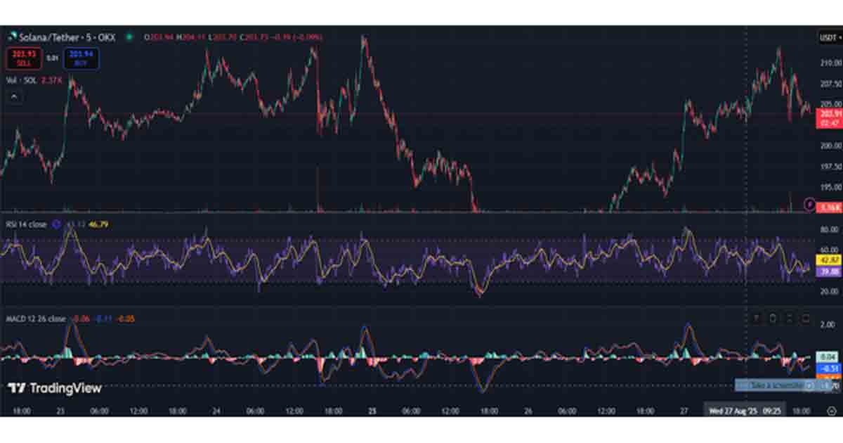 The RSI of about 43-46 has been neutral at most, with some oversold positions being suggested. The MACD is also flattened around zero, indicating consolidation; however, a buoyancy crossover might initiate momentum. The most important resistance is at $210-$212, and the best support is at $198-$200. Maintaining an upward trend of above RSI 50 and a positive MACD may propel SOL further, yet a loss of 200 dollars may draw it back to $195.