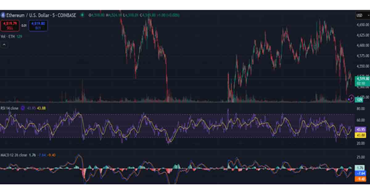 Ethereum (ETH) is trading around $4,519 after experiencing notable volatility. The chart shows a recent sharp decline from above $4,625 toward the $4,500 zone before attempting a mild recovery. The RSI at 43–44 reflects neutral to slightly oversold conditions, suggesting selling pressure has eased but buying strength remains limited. This indicates ETH is consolidating after its drop, with momentum yet to confirm a clear reversal. The MACD remains negative, with histogram bars showing weak momentum, signaling consolidation may continue in the short term. Key resistance is seen around $4,575–4,600, where recent sell-offs began, while strong support lies near $4,480–4,500. If ETH holds above support and RSI moves above 50 with a MACD crossover, the next bullish target could be $4,600+.