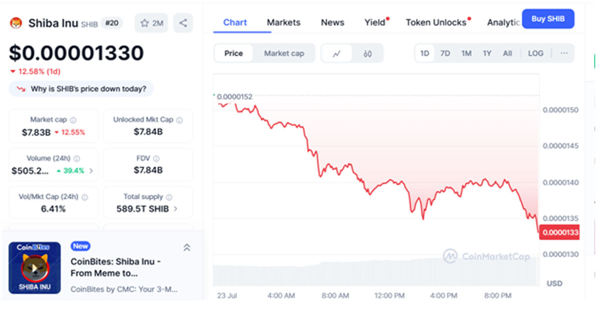 Shiba Inu (SHIB), once hailed as the next Dogecoin, is showing signs of exhaustion. Despite maintaining a $7.83 billion market cap, SHIB has recently dropped 12.58% in a single day and is now priced at $0.00001330. Although trading volume is up by 39%, it suggests heightened volatility rather than renewed optimism.
