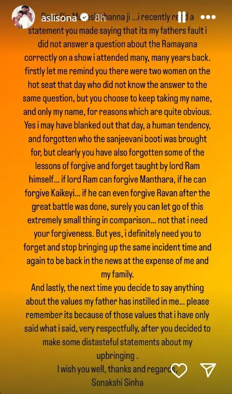 সোনাক্ষী (Sonakshi Sinha) তার ইনস্টাগ্রামের স্টোরিতে মুকেশ খান্নাকে উদ্দেশ্য করে লেখেন, “প্রিয় মুকেশ খান্না জি, আমি আপনার সাম্প্রতিক একটি বিবৃতি পড়েছি যেখানে আপনি বলেছেন আমার রামায়ণ সম্পর্কে অজ্ঞতার জন্য এটি আমার বাবার দোষ। প্রথমত আমি মনে করিয়ে দিই যে সেদিন আমি একা ছিলাম না। আমার পাশে আরও একজন প্রতিযোগী ছিলেন, তিনিও প্রশ্নের উত্তর জানতেন না। কিন্তু আপনি শুধু আমাকেই নিশানা করছেন, কারণটা খুবই স্পষ্ট।”