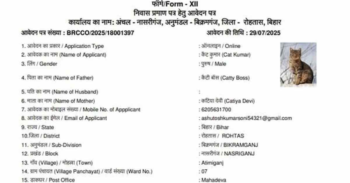 বিহারে (Bihar) ফের নজিরবিহীন ঘটনা। কখনও ‘ডগ বাবু’, কখনও ‘সোনালিকা ট্র্যাক্টর’, এবার ‘ক্যাট কুমার’। মুখ্যমন্ত্রী নীতীশ কুমারের রাজ্যে একের পর এক জাল রেসিডেন্সিয়াল সার্টিফিকেট আবেদনের ঘটনা প্রশাসনকে চাপে ফেলেছে। সর্বশেষ ঘটনাটি রোহতাস জেলার, যেখানে ‘ক্যাট কুমার’ নামে একজন রেসিডেন্সিয়াল সার্টিফিকেটের জন্য অনলাইন আবেদন জমা দিয়েছেন। আবেদনে আবেদনকারীর বাবার নাম দেওয়া হয়েছে ‘ক্যাটি বস’ এবং মায়ের নাম ‘ক্যাটিয়া দেবী’। শুধু তাই নয়, আবেদনপত্রে একটি বেড়ালের ছবিও সংযুক্ত করা হয়েছে।