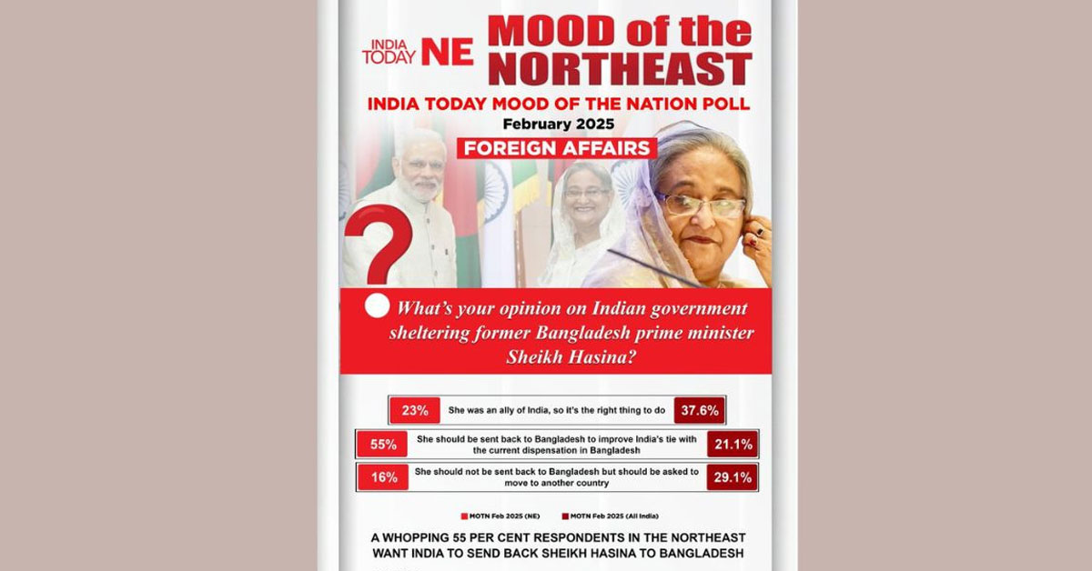 শেখ হাসিনার বিরুদ্ধে গণহত্যার মামলায় বিচার চলছে বাংলাদেশে। তার ফাঁসির দাবি উঠেছে। বাংলাদেশের অন্তর্বর্তী সরকারের তরফে শেখ হাসিনাকে প্রত্যর্পণের জন্য ভারত সরকারের কাছে বার্তা এসেছে। এই বার্তায় ভারত সাড়া দেবে কি দেবেনা এমন কূটনৈতিক জল্পনা তীব্র। এই প্রেক্ষিতে India Today NE একটি জনমত সমীক্ষা চালায়। সমীক্ষায় দেখা গেছে উত্তর পূর্বাঞ্চলের রাজ্যগুলির ৫৫ শতাংশ চাইছেন শেখ হাসিনাকে বাংলাদেশে পাঠানো হোক।