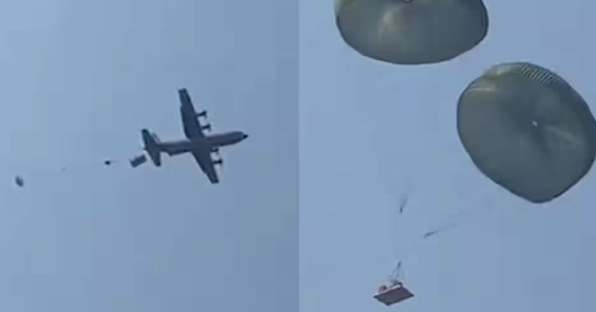 #WATCH | Indian Air Force tested BHISHM portable cubes at Agra for airdrop from the aircraft. This is the first time when they have tested this portable hospital. This test was performed so that anywhere this hospital can be deployed to cater to emergency situations.]