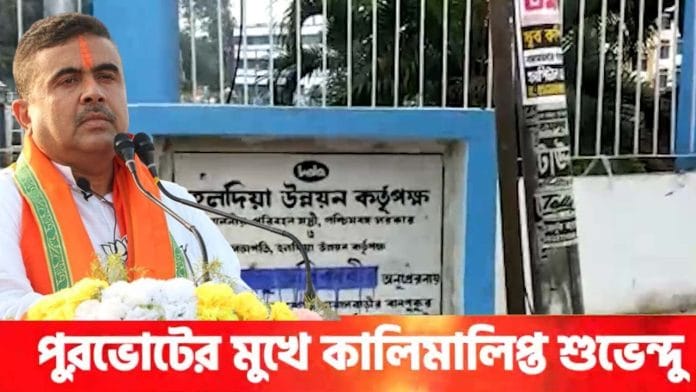 পুরভোটের আগেই তমলুক সরগরম শুভেন্দুর নামে কালি পড়ল। পুরভোটে জম জমাট পূর্ব মেদিনীপুর (Purba Medinipur) জেলার তমলুক। রবিবার ভোটের আগেই বিরোধী দলনেতা শুভেম্দু অধিকারীর নামাঙ্কিত ফলকে কালি লেপা হয়। তমলুকের বানপুকুর ধারে হলদিয়া উন্নয়ন পর্ষদের উন্নয়নের ফলক বিকৃত করার ঘটনা রাজনৈতিক হাওয়া গরম।