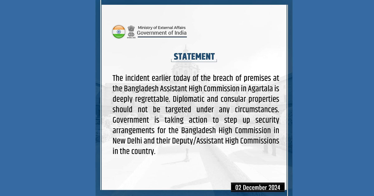 বিদেশমন্ত্রকের বিজ্ঞপ্তিতে লেখা হয়েছে,’আগরতলায় বাংলাদেশ সহকারী হাইকমিশনের প্রাঙ্গণ ভাঙার ঘটনাটি গভীরভাবে দুঃখজনক। কূটনৈতিক এবং কনস্যুলার সম্পত্তি কোনো অবস্থাতেই লক্ষ্যবস্তু করা উচিত নয়। নয়াদিল্লিতে বাংলাদেশ হাইকমিশন এবং দেশে তাদের ডেপুটি/সহকারী হাইকমিশনের নিরাপত্তা ব্যবস্থা জোরদার করার জন্য সরকার ব্যবস্থা নিচ্ছে।’