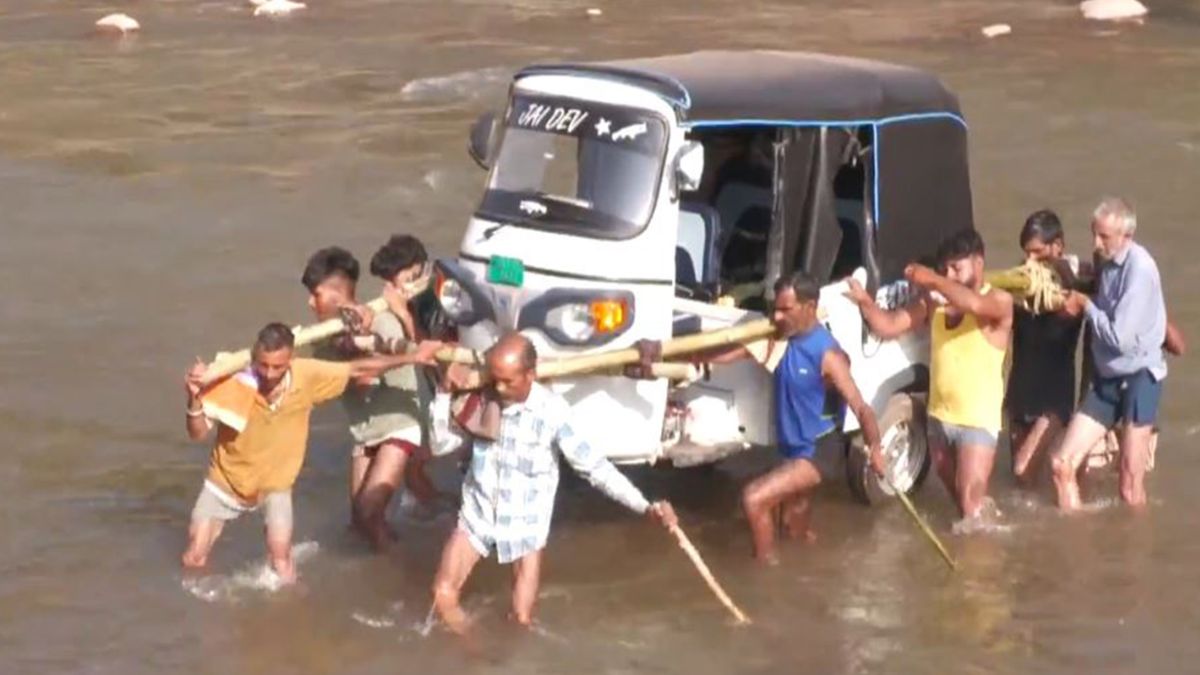 শ্রীনগর: বন্যায় বিপর্যস্ত জম্মু কাশ্মীর। প্রবল বর্ষণ (Heavy Rain), ধ্বসের (Landslide) জেরে ভেঙে গিয়েছে ব্রিজ। অগত্যা হাঁটুজলে অটোকে কাঁধে তুলে নদী পারাপার করছেন গ্রামবাসীরা। জম্মু কাশ্মীরের (J&K) উধমপুর জেলার বান্ত গ্রামে এই দৃশ্য ধরা পড়েছে। “বৃষ্টির জেরে জলের তোড়ে মাত্র ১০ বছরের পুরনো ব্রিজ ভেসে গিয়েছে”, বলে জানান দেশ রাজ নামক এক গ্রামবাসী।