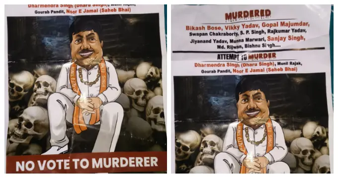 ভোটের আগে খুলির উপরে বসে ব্যারাকপুরের বিজেপি প্রার্থী অর্জুন সিং! হঠাৎ ভোটের আগে কী হলো ব্যারাকপুরের বাহুবলীর? জানা গিয়েছে যে, গত মঙ্গলবার শ্যামনগর এলাকার কিছু বাড়িতে খবরের কাগজ খুলতেই একটা পোস্টার নজরে আসে অনেকেরেই! একটি পোস্টার যেখানে দেখা যাচ্ছে কতগুলি খুলির উপরে বসে আছে অর্জুন সিং। পোষ্টারে তাঁর নাম লেখা রয়েছে পল্টু সিং! এছাড়াও পোষ্টারে নজরে আসে কতগুলো নাম যারা বিগত কয়েক বছরে ওই ব্যারাকপুর লোকসভা কেন্দ্রে খুন হয়েছে। যেমন বিকাশ বোস, ভিকি যাদব, গোপাল মজুমদার এছাড়াও অনেকে। এখানেই শেষ নয়, খুনের চেষ্টা হয়েছে ধরমেন্দ্র সিংহ, গৌরব পণ্ডিত, নুরই জামাল সহ প্রমুখ। পোস্টারের নীচে লেখা ‘নো ভোট টু মাডারার।’