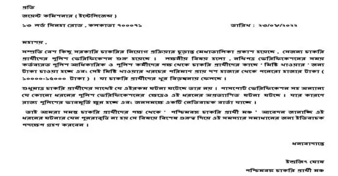 এ বিষয়ে ইতিমধ্যে চাকরি প্রার্থী মঞ্চের তরফে জয়েন্ট কমিশনারের কাছে চিঠি পাঠানো হয়েছে।