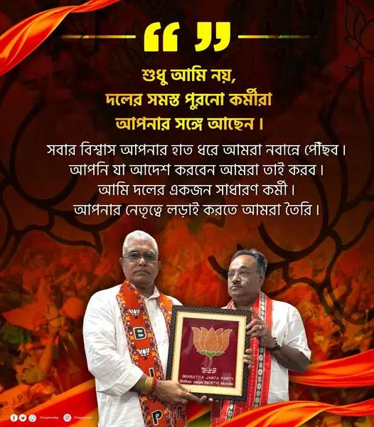 সবার বিশ্বাস, আপনার হাত ধরে আমরা নবান্ন পৌঁছব। আপনি যা আদেশ করবেন, তাই করব। আমি দলের একজন সাধারণ কর্মী। আপনার নেতৃত্বে লড়াই করতে আমরা তৈরি।” দিলীপ ঘোষের Dilip Ghosh) এই বার্তা রাজ্য বিজেপির অভ্যন্তরীণ আদি নব্য দ্বন্দ্ব কে নস্যাৎ করেছে। তার সাথে দিয়েছে শমীক ভট্টাচার্যের নেতৃত্বের প্রতি দলের প্রতিশ্রুতি। যা আসন্ন নির্বাচনে দলের কৌশলগত প্রস্তুতির ইঙ্গিত দিচ্ছে।