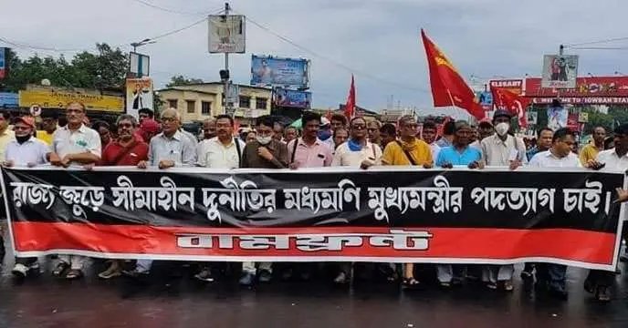 এসএসসি নিয়োগ দুর্নীতিতে কোটি কোটি টাকা সমেত তৃণমূল কংগ্রেস মহাসচিব পার্থ চট্টোপাধ্যায় ও তাঁর বান্ধবী অর্পিতা মুখার্জি ধৃত। রাজ্য জুড়ে চলছে ইডি অভিযান। পার্থ ও অর্পিতার জেরা চলছে। এই পরিস্থিতিতে মুখ্যমন্ত্রীর পদত্যাগ দাবি করে আন্দোলনকারী চাকরি প্রার্থীদের ধর্নামঞ্চে তিনটি মিছিল নিয়ে বিরাট জমায়েত করে বামফ্রন্ট। মিছিলে অংশ নেন ফ্রন্ট চেয়ারম্যান বিমান বসু সহ শরিক দলগুলির নেতা ও সমর্থকরা।