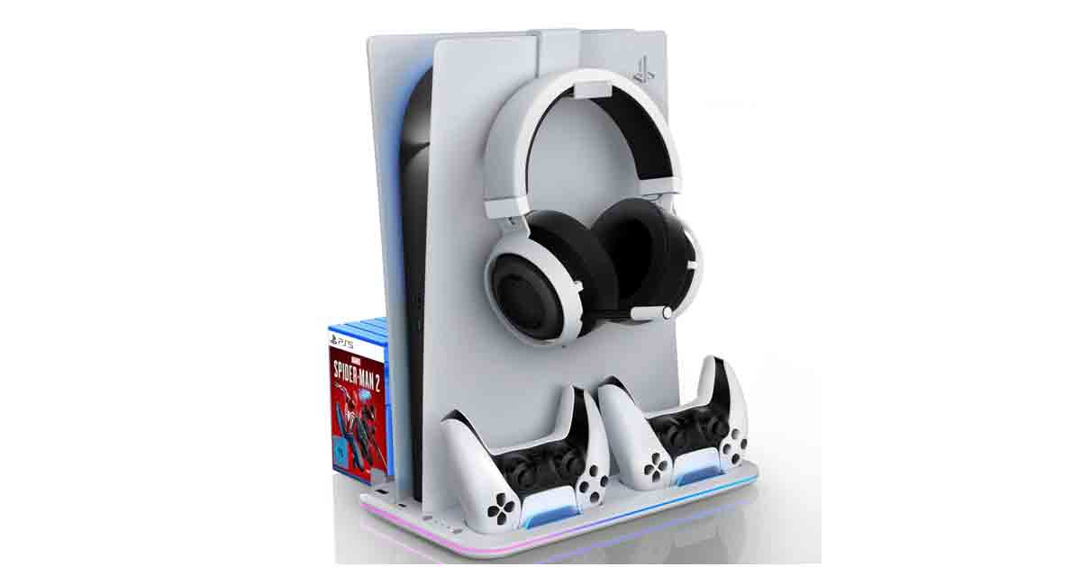 The PS5 Cooling & Charging Dock is an all-in-one solution for console users that keeps their system cool, charges it, and organises it. It has two turbo fans, two controller charging slots, a headset holder, and room for game discs, which helps users keep their gaming setup clean and organised. It looks good and works well because it is small and has ambient lighting.