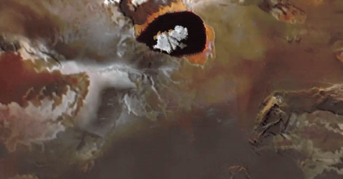“আইও কেবল আগ্নেয়গিরি দিয়ে ভরা, এবং আমরা তাদের কিছুকে ধরেছি যখন তারা সক্রিয় ছিল,” বোল্টন NASA জেট প্রপালশন ল্যাবরেটরি রিলিজে বলেছেন। ছবিতে, এই দ্বীপগুলি গরম লাভায় ভরা সম্ভাব্য ম্যাগমা হ্রদের মাঝখানে অবস্থিত দেখা যায়। এটা একেবারে আশ্চর্যজনক দেখায়। “আমাদের যন্ত্রগুলির দ্বারা রেকর্ড করা হ্রদের স্পেকুলার প্রতিফলন দেখায় যে IO এর পৃষ্ঠের অংশগুলি গ্লাসযুক্ত-মসৃণ, পৃথিবীতে আগ্নেয়গিরিরভাবে গঠিত অবসিডিয়ান কাচের স্মরণ করিয়ে দেয়।”