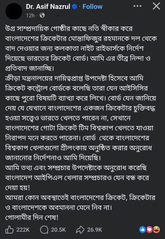 শনিবার নিজের ফেসবুক পোস্টে ক্রীড়া উপদেষ্টা আসিফ নজরুল লেখেন, “বাংলাদেশের একজন ক্রিকেটার চুক্তিবদ্ধ হওয়া সত্ত্বেও যেখানে ভারতে খেলতে পারেন না, সেখানে গোটা ক্রিকেট দল বিশ্বকাপ খেলতে যাওয়া নিরাপদ মনে করতে পারে না।”