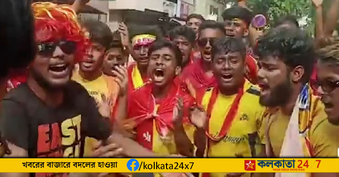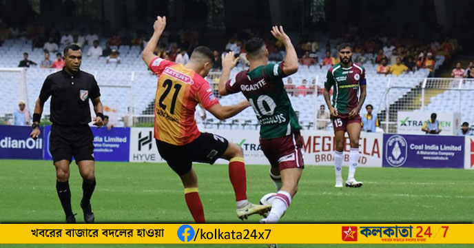 - প্রতি আক্রমণ মোহনবাগানের। কোনোরকমে পরিস্থিতি সামাল লাল-হলুদ ডিফেন্ডারদের।
