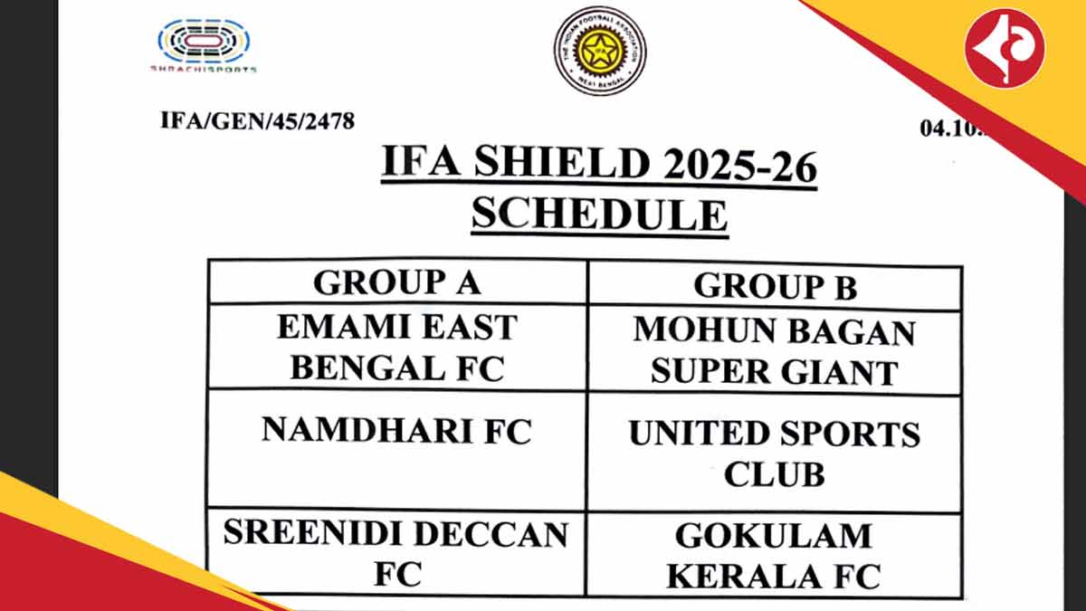 দীর্ঘ বিরতির পর আবারও শুরু হচ্ছে ঐতিহ্যবাহী আইএফএ শিল্ড। প্রকাশ্যে এল ২০২৫ সালের আইএফএ শিল্ডের (IFA Shield 2025 Schedule) সূচি। আগেই জানা গিয়েছিল, এই বছরের প্রতিযোগিতায় ছয়টি দলকে দু’টি গ্রুপে ভাগ করা হয়েছে। শনিবার আনুষ্ঠানিকভাবে সূচি ঘোষণা করল আইএফএ। যদিও মোহনবাগান (Mohun Bagan SG) ও ইস্টবেঙ্গলকে (East Bengal) রাখা হয়েছে দু’টি আলাদা গ্রুপে। ফলে গ্রুপ পর্বে ডার্বির সম্ভাবনা নেই। তবে দুই প্রধান যদি ফাইনালে পৌঁছয়, তাহলে যুবভারতী ক্রীড়াঙ্গনে হতে পারে ডার্বি ম্যাচ (Kolkata Football News)।