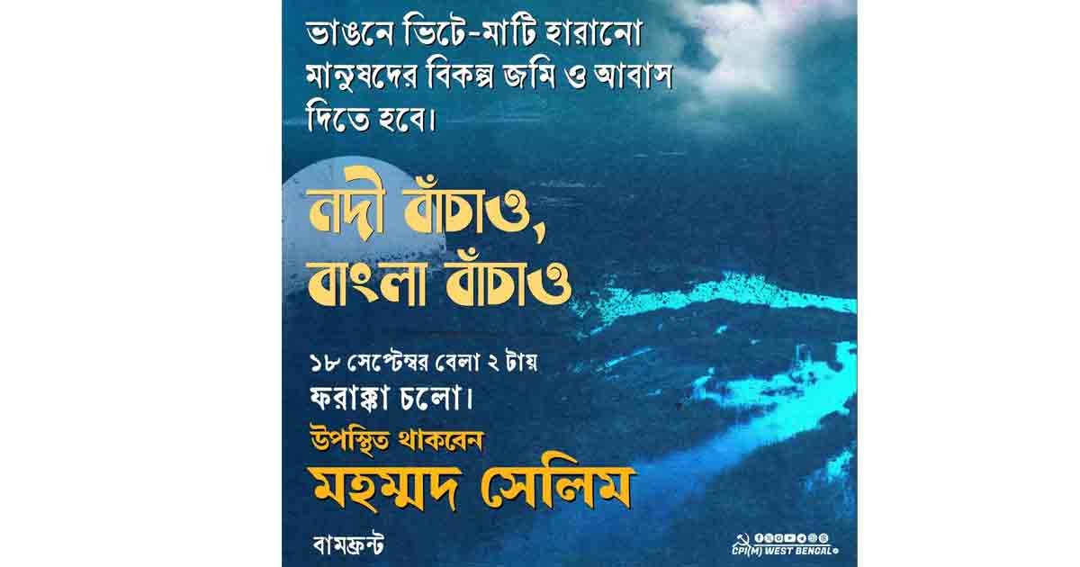 বামফ্রন্ট সূত্রে খবর, ‘নদী বাঁচাও বাংলা বাঁচাও’ দাবি তুলে ফারাক্কায় সমাবেশ হবে আগামী ১৮ সেপ্টেম্বর। ফারাক্কার সমাবেশে হাজির থাকবেন সিপিআইএম রাজ্য সম্পাদক মহম্মদ সেলিম ও জেলা বামফ্রন্ট নেতৃত্ব।