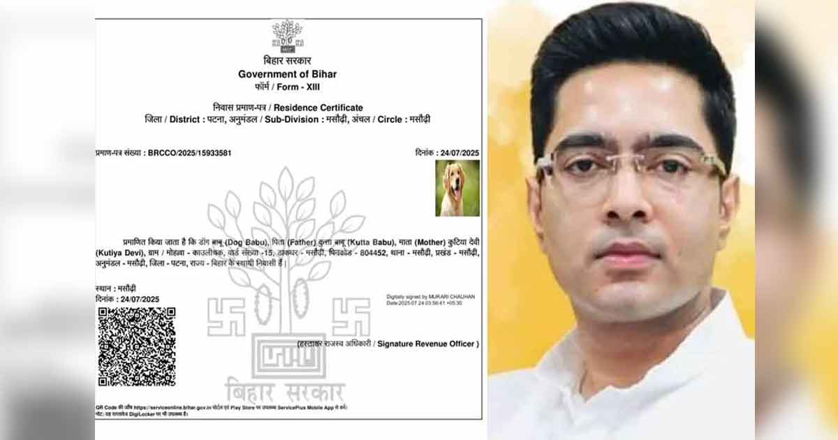 ভোটের মুখে দাঁড়িয়ে থাকা বিহারে এক নজিরবিহীন ঘটনা ঘিরে তৈরি হয়েছে তীব্র বিতর্ক। সোশ্যাল মিডিয়ায় ভাইরাল একটি স্থায়ী বাসিন্দার শংসাপত্র (রেসিডেন্সিয়াল সার্টিফিকেট), যেখানে প্রাপক একজন মানুষ নন, বরং একটি কুকুর (Dog Gets Residential Certificate)! ‘ডগ বাবু’ নামক সেই কুকুরের বাবার নাম দেওয়া হয়েছে ‘কুত্তা বাবু’ এবং মায়ের নাম ‘কুতিয়া দেবী’। শংসাপত্রে স্পষ্টভাবে কুকুরটির ছবি দেওয়া রয়েছে। এই ঘটনা সামনে আসতেই দেশজুড়ে ছড়িয়ে পড়ে বিস্ময়, তৈরি হয় রাজনৈতিক বিতর্ক।