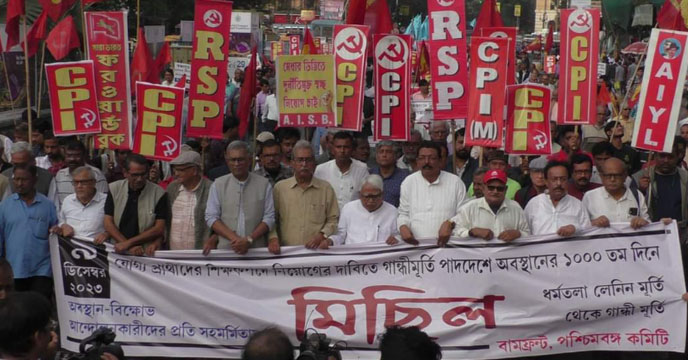 যোগ্য চাকরিপ্রার্থীদের শূন্যপদে নিয়োগের দাবিতে অবস্থানের ১০০০ দিনে বামফ্রন্টের ডাকে ধর্মতলার লেনিন মূর্তি থেকে গান্ধী মূর্তি মিছিল হল। উপস্থিত ছিলেন বামফ্রন্ট চেয়ারম্যান ও CPIM নেতা বিমান বসু সহ অন্যান্য নেতৃত্ব। তাৎপর্যপূর্ণ, যে চাকরিপ্রার্থীরা ধর্ণা মঞ্চ থেকে তৃণমূল মুখপাত্র কুণাল ঘোষকে দেখে রাজ্য সরকারের বিরুদ্ধে চোর চোর স্লোগান দিয়েছিলেন, তারাই বামফ্রন্ট চেয়ারম্যান বিমান বসুর কথা শুনলেন ধৈর্য্য সহ।